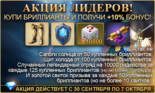 А также за каждые 125 приобретённых бриллиантов вы получите отсутствующий у вас случайный отряд легендарных существ на 10,000 лидерства в подарок (не более 5 отрядов)!